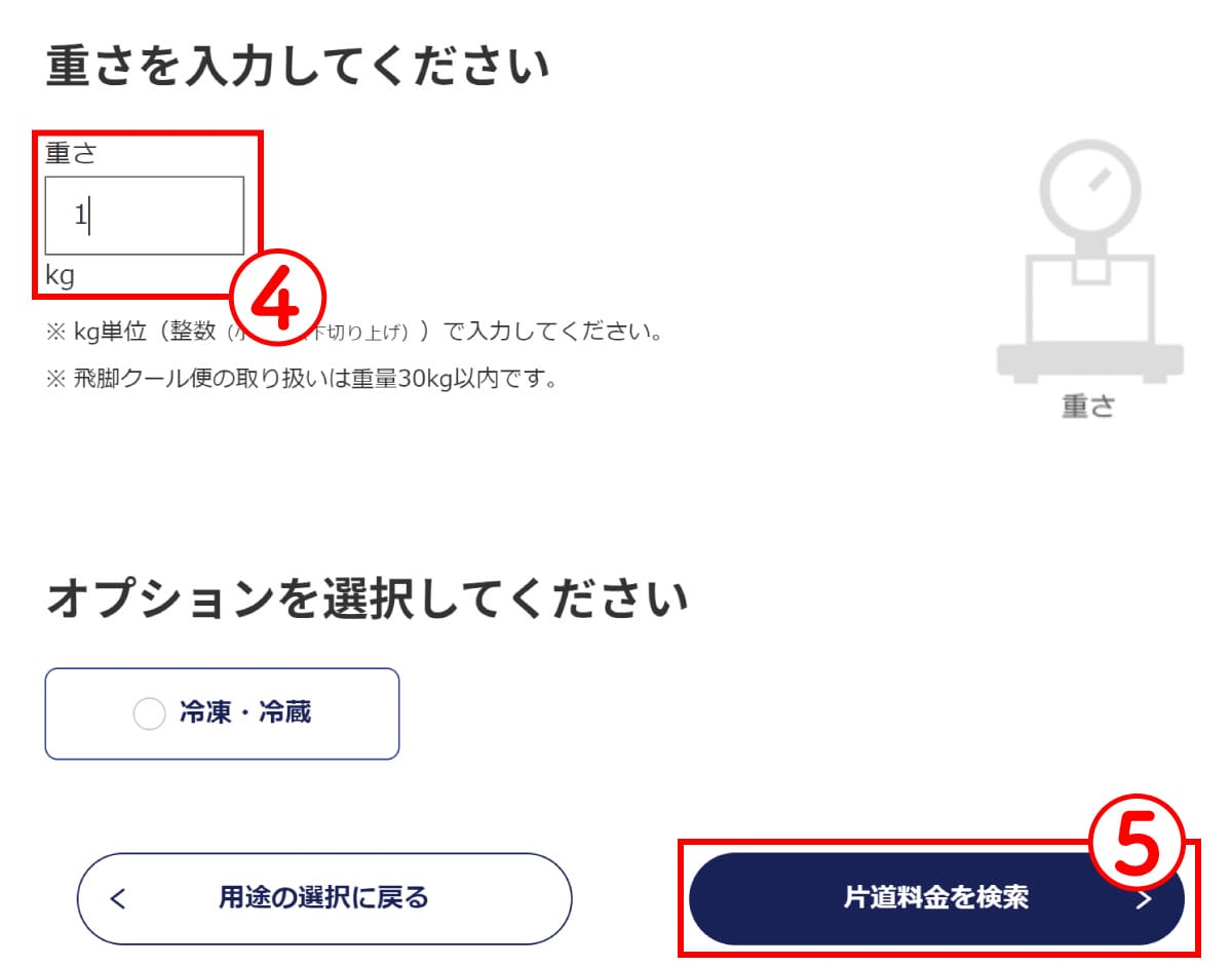 【3】④荷物の重さを入力し、⑤「片道料金を検索」をクリックします