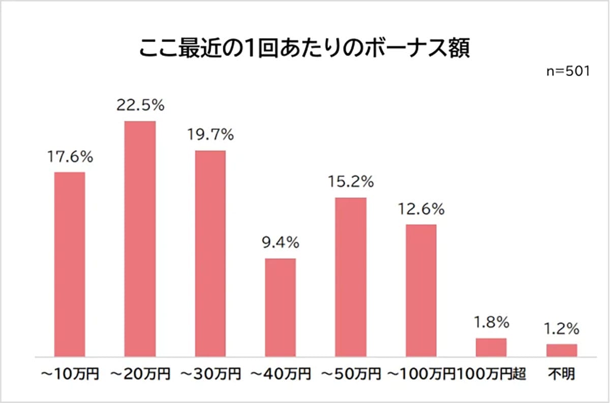 ボーナス額についても尋ねたところ、平均値は34.9万円だが、ボリュームゾーンは10万~20万円という結果になった。ボーナスはありがたいものの、金額的には大きな買い物には少し足りないと言える。ボーナス額のアップはもちろんだが、日本の物価高や経済的な不安が落ち着くことを願うばかりだ。