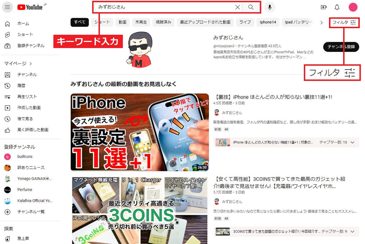 ほかにも「チャンネル」で検索すると、キーワードに関連したチャンネルが上位に表示されるので、チャンネルを探しているときに使うと便利ですよ。