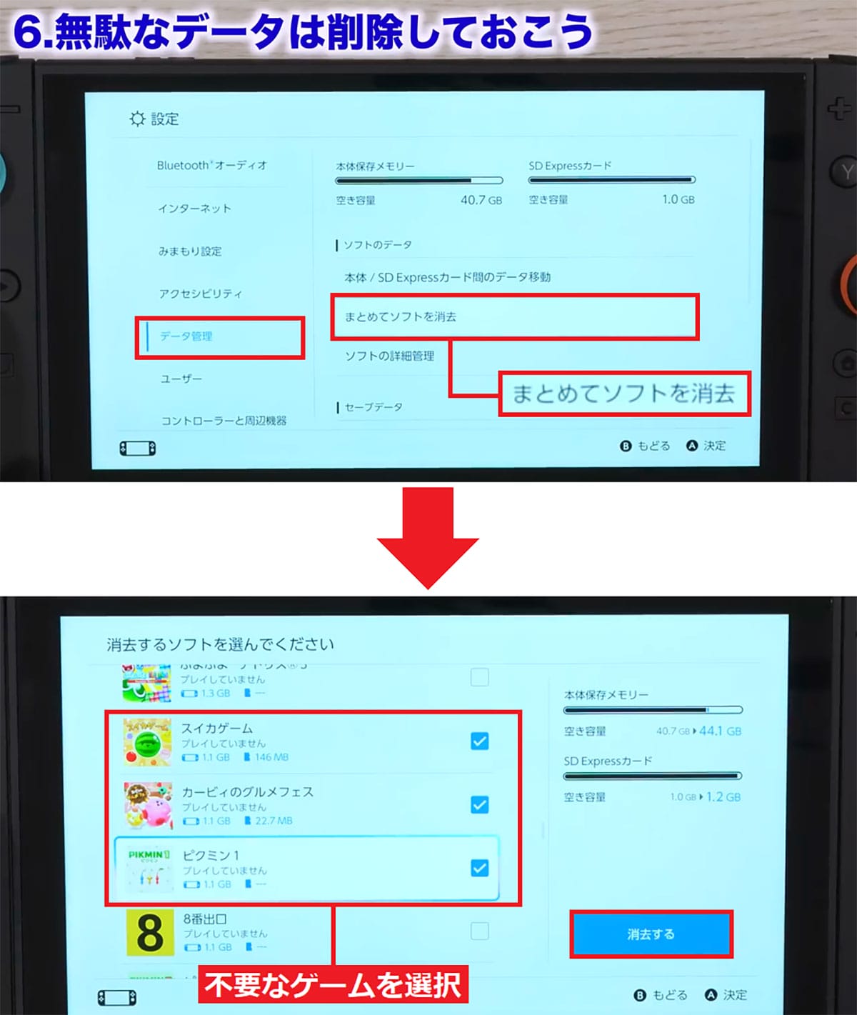 まとめてソフトを消去では、内蔵メモリーだけでなくSDカードの状況も分かります。基本的に、容量が大きい順にゲームが並んでいますが、画面をスクロールして、あまり遊んでいない容量の大きいゲームを探してみましょう。