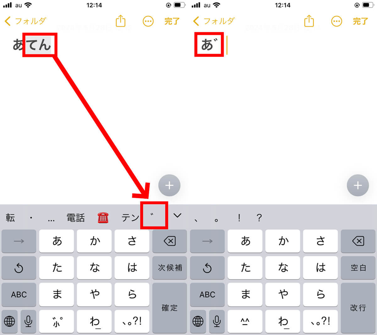 【1】「あ」を入力したあとに「てん」と打つと、予測変換に「゛」が表示されます。【2】タップすると「あ゛」になります