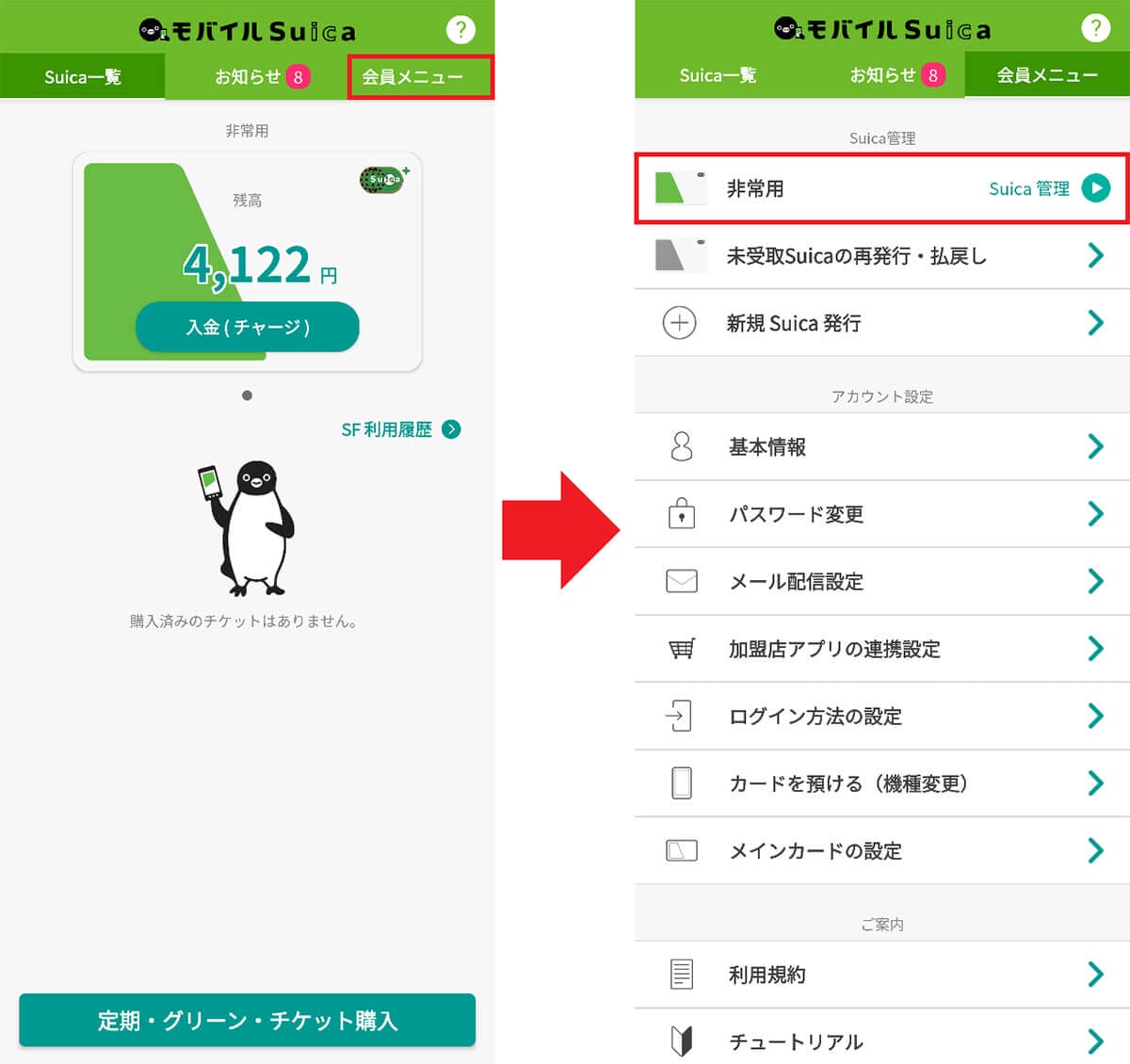 まず、モバイルSuicaを開いて「会員メニュー」をタップ(左写真)。次に、登録されているSuicaを選択します(筆者はSuica名称を「非常用」にしています)(右写真)