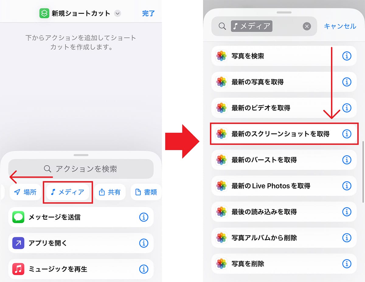最初に「ショートカット」アプリを起動して、右上の「+」ボタンを押します。すると、「新規ショートカット」画面が表示されるので、「アクションを検索」欄下のメニューを左にスワイプして「メディア」を選択。