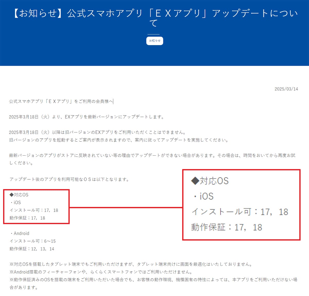 さらに厳しいのが東海道・山陽・九州新幹線のネット予約サービス「スマートEX」のアプリ「EXアプリ」が、2025年3月18日のバージョンアップにより、iOS 17以上でなければ利用できなくなりました(旧バージョンは利用不可)。
