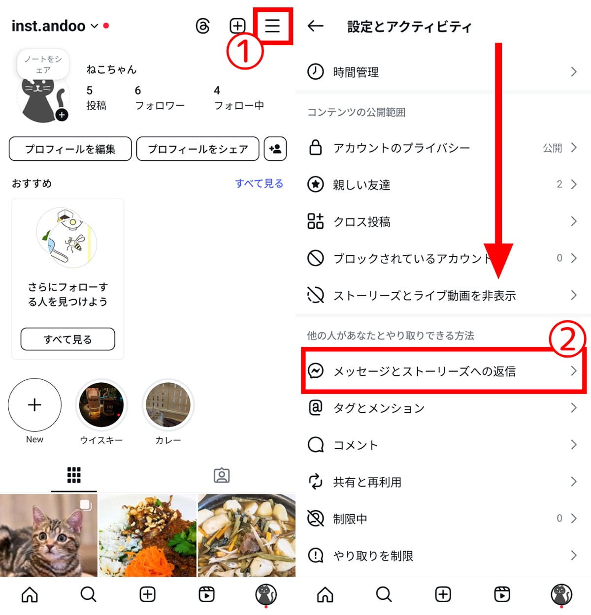 【1】自身のプロフィール画面を開き、右上の①三本線ボタンをタップ。【2】下にスクロールし、②「メッセージとストーリーズへの返信」に進みます